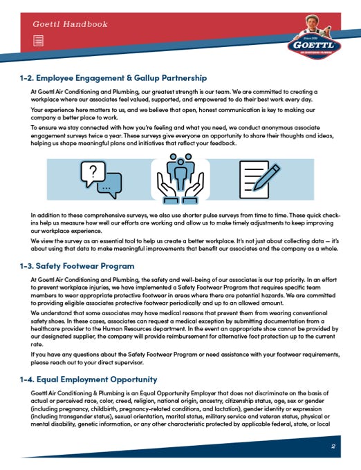 Designed in Adobe InDesign, this 48-page handbook transforms essential company information into a well-structured and brand-aligned resource for employees. I used branded photography to introduce each section with impact, while icons and typographic hierarchy broke up dense content across interior pages. To ensure efficiency and consistency, I applied paragraph styles throughout, making the document both visually appealing and easy to update. The result is a polished, functional guide that reflects Goettl’s professionalism and commitment to clarity.