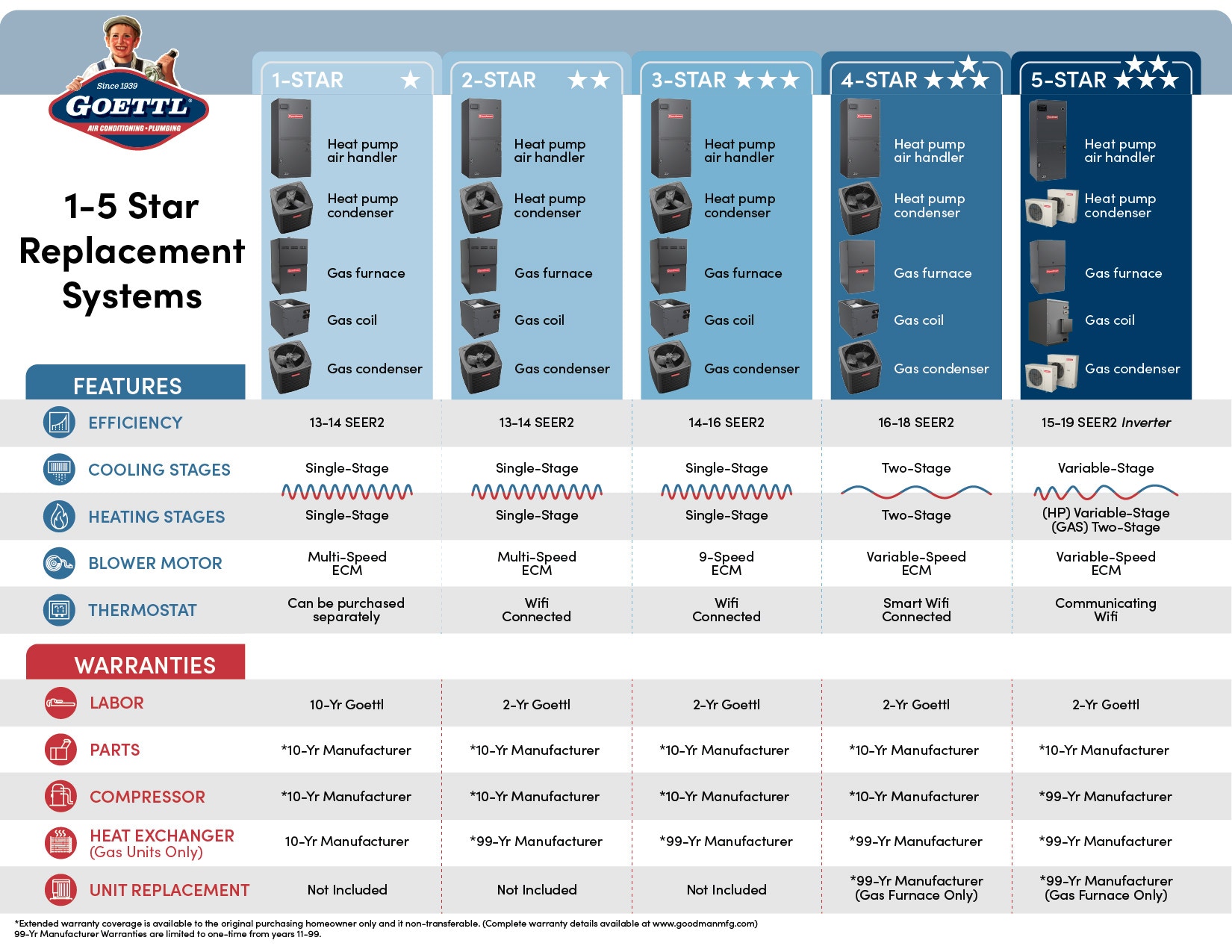 This printed sales tool was developed in Adobe Illustrator to help Goettl sales reps present HVAC system options in a clear, comparative format. The layout uses a matrix structure to allow side-by-side evaluation of products ranked 1 to 5 stars, with rows dedicated to features and warranty details. I included product imagery and a custom set of icons to support quick visual scanning and reinforce product benefits. The design enhances sales conversations by making complex information simple, organized, and easy to communicate.