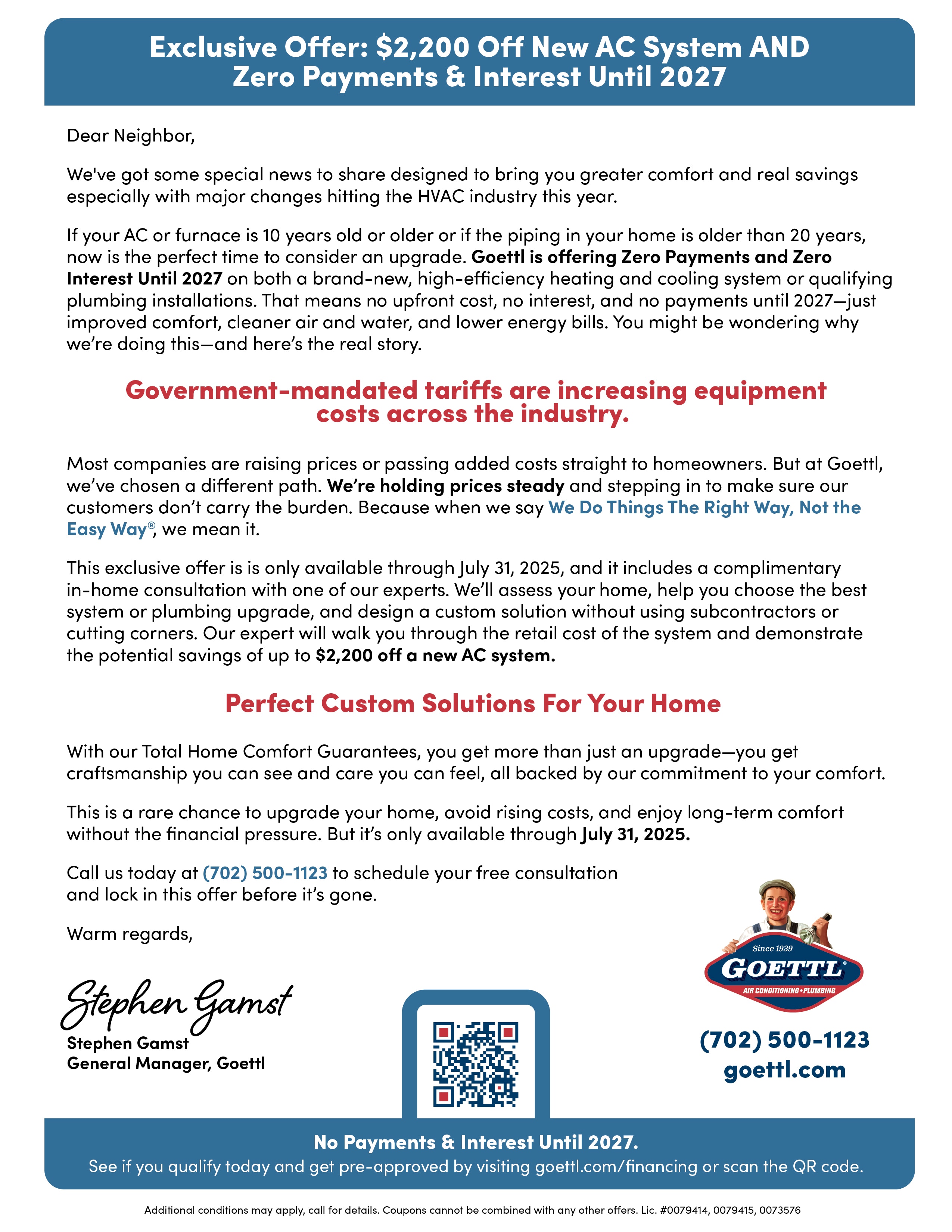 This direct mail piece was designed to convey a persuasive message using only typography and layout. I worked within Goettl’s brand standards to create a text-forward design that maintained reader interest through bold headings, color accents, and thoughtful spacing. To meet campaign goals, I produced six tailored versions of the letter, each containing branch-specific messaging and a unique QR code for localized response tracking. The design balances brand voice with functional clarity, helping drive measurable customer engagement.
